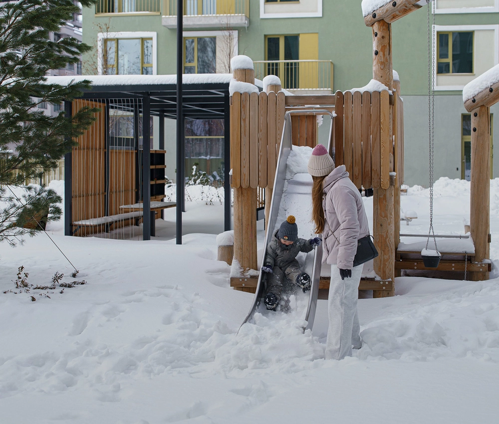 Двор в Бруснике закрыт от машин, посторонних людей и хорошо просматривается с любой точки. Дети играют и гуляют в безопасности. Во дворе растут высокие деревья и цветы. Нет ни одного темного угла.